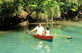 游客可乘坐小船荡漾在弯弯曲曲的河上一边欣赏沿途的的椰子树、香蕉林等原始的热带景色,一边听导游讲解当地的历史和文化习俗,还可以向船上抱着木吉他的当地歌手点一曲柔情似水的英文老歌,随着歌声慢慢享受这让人沉醉的气息;乘船顺流而下,两岸皆是质朴的民居,有时候也许你会碰到调皮的孩子冲你大喊一声,待游客目光转向他,便从岸边高大的椰子树上纵身跳下,然后从河中心冒出脑袋;也有漂亮的姑娘们在河边搭的竹台上弹着吉他,载歌载舞,热情欢迎每位游客的到来。
