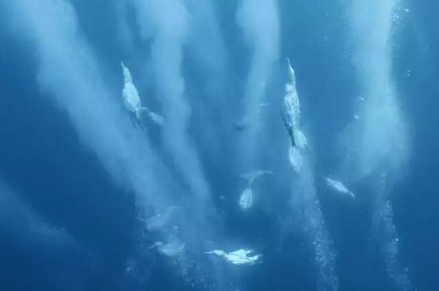 鸟群啼鸣着逆风而翔,然后空中准确定位瞄准好鱼群后,瞬间完成转身,变成顺风俯冲,收翅!重力加速度!最后身体呈为完美的流线形,大约以每小时120公里的速度扎破海面,给人以强烈的视觉冲击力,特别在水下,鲣鸟俯冲下来,形成一条白色的水雾线条,其实图片很难表现出那种气势,漫天的鸟鸣声,不断有鲣鸟在身边呼啸冲入水中,海中水花四溅,加上冲入水时,噗嗤噗嗤的响声,非常的震撼!